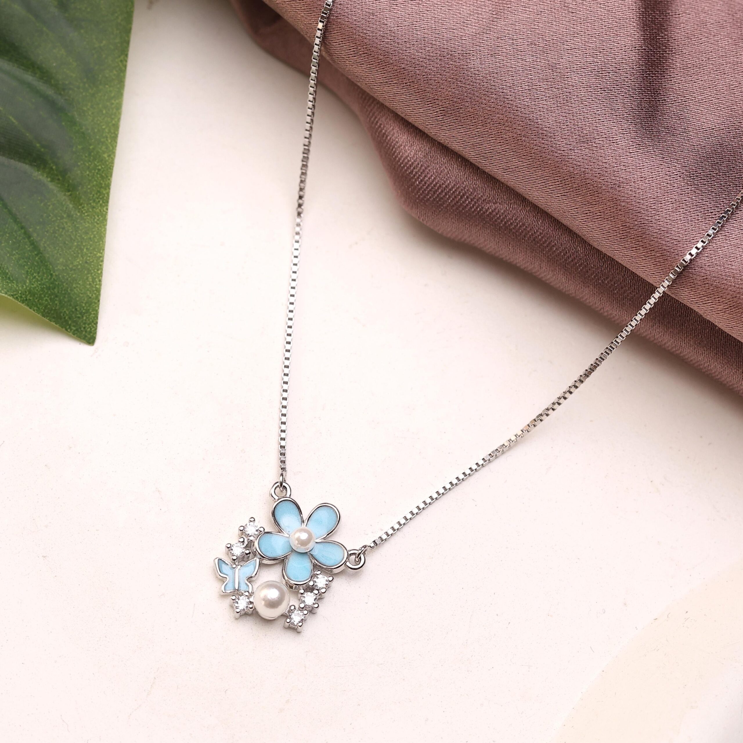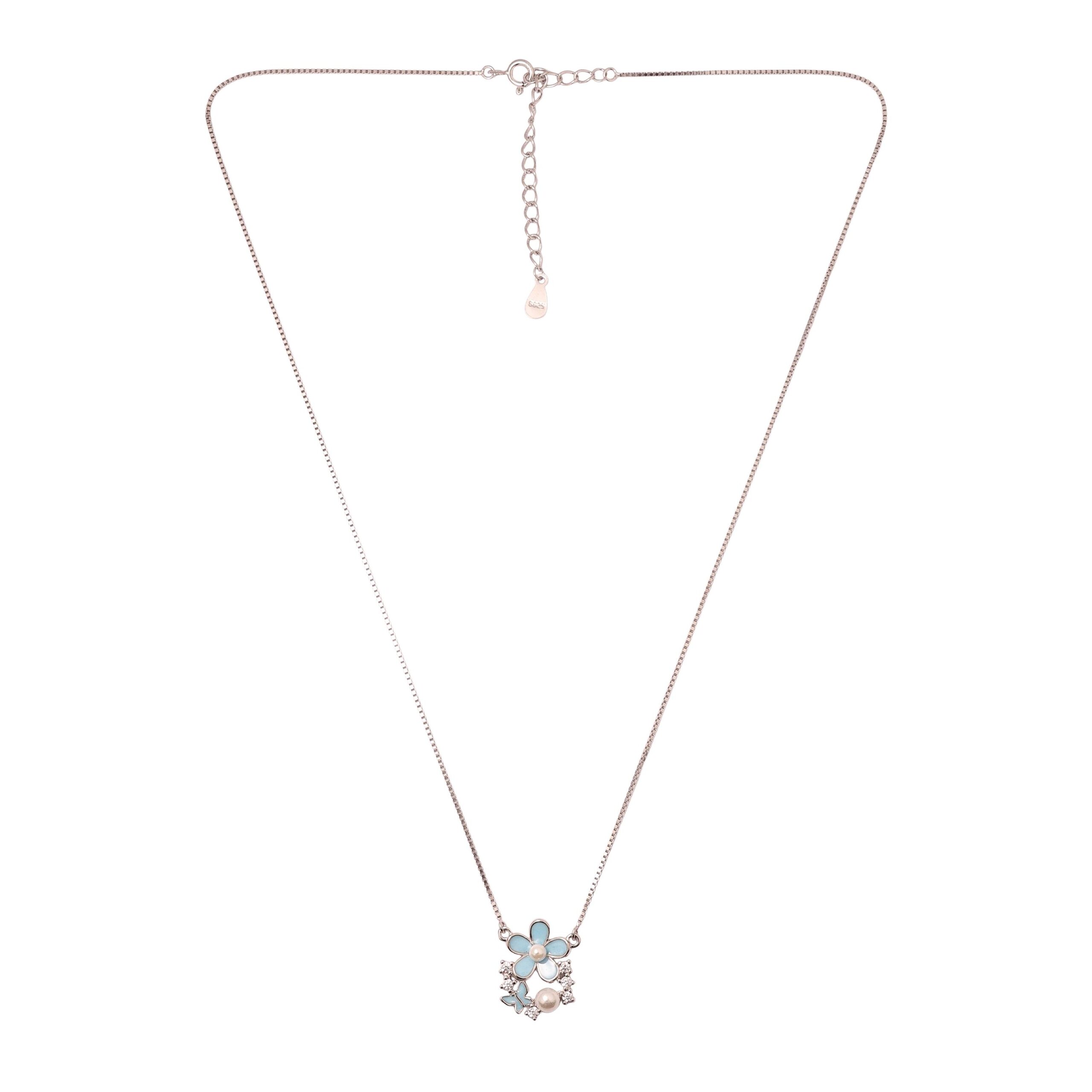 This beautiful necklace is crafted from sterling silver and features a delicate blue floral charm accented with luminous pearls and subtle sparkle. Elegant yet lightweight, it is perfect for everyday wear or special occasions. A graceful piece that adds a fresh, feminine touch to any outfit. Features: