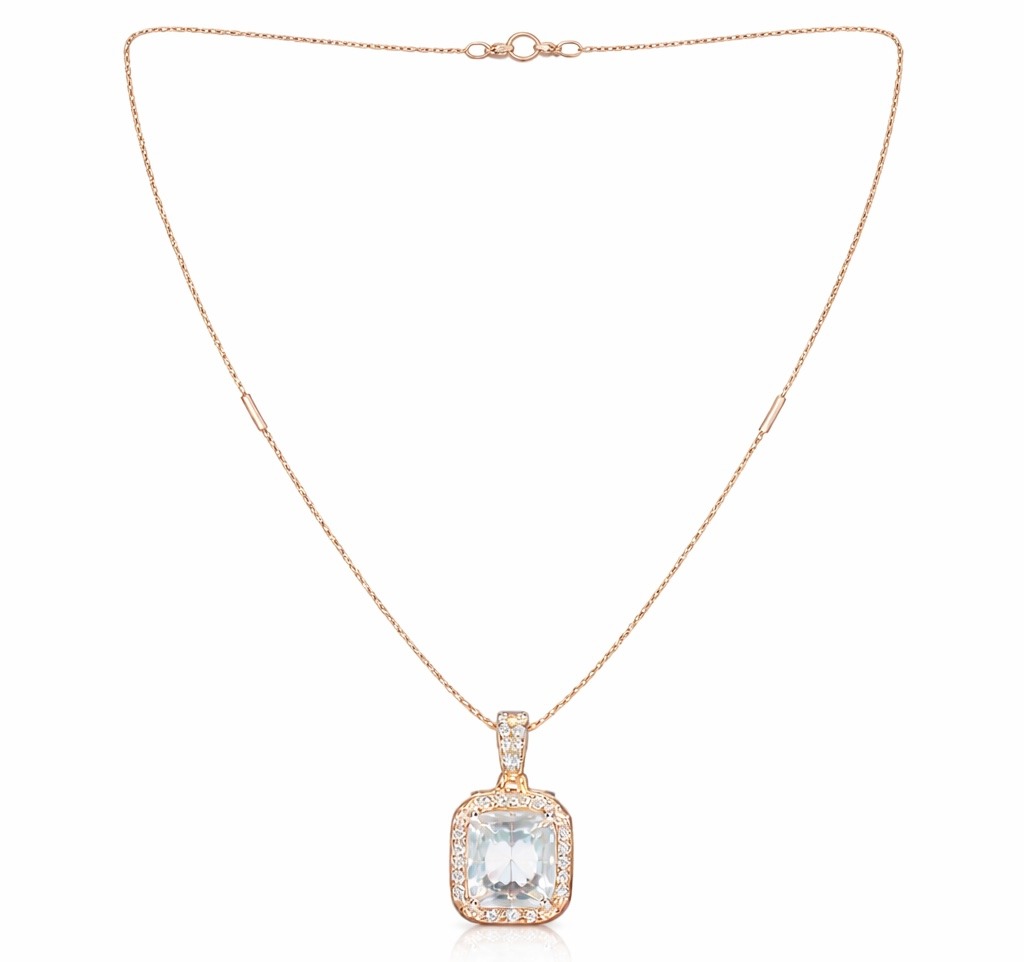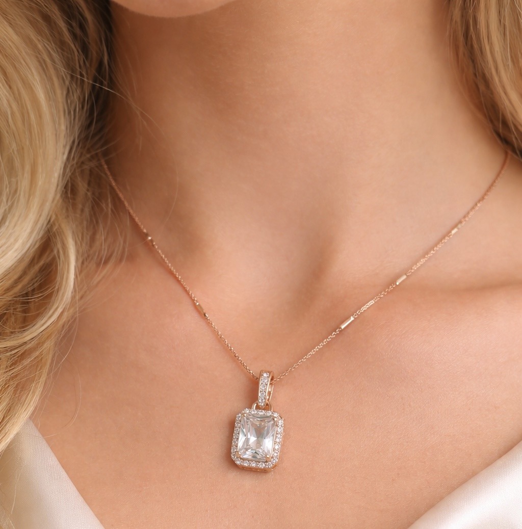 Crafted in radiant rose gold, this exquisite necklace features a brilliant cushion-cut centerpiece, surrounded by a delicate halo of shimmering stones that reflect light beautifully from every angle. The fine chain adds a touch of minimal sophistication, making it perfect for both daily wear and special occasions.
