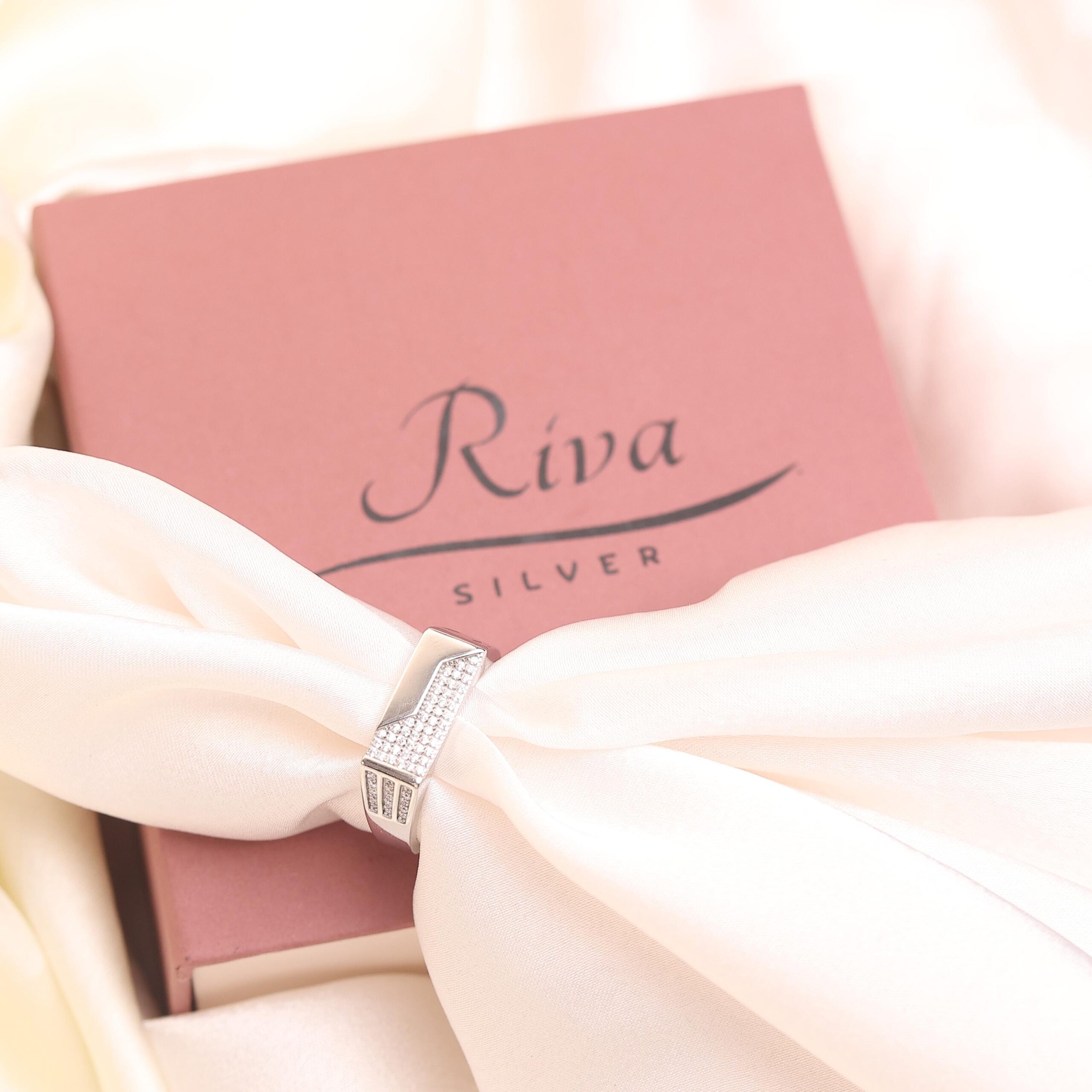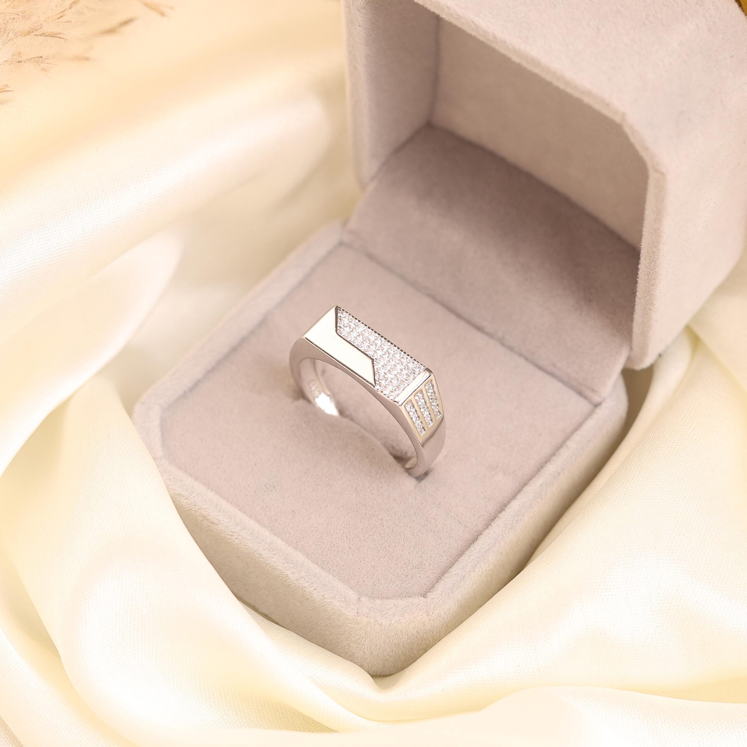A modern men’s silver ring featuring a sleek diagonal pavé detail for subtle shine and confident style.