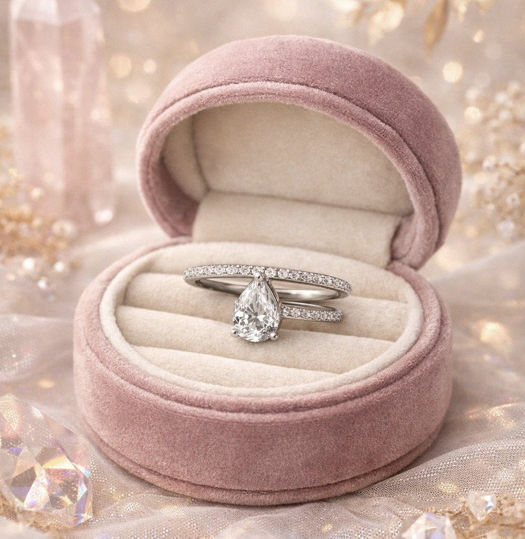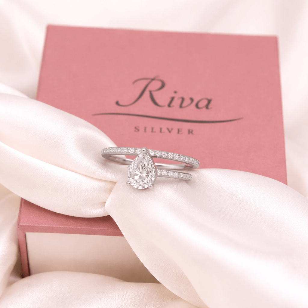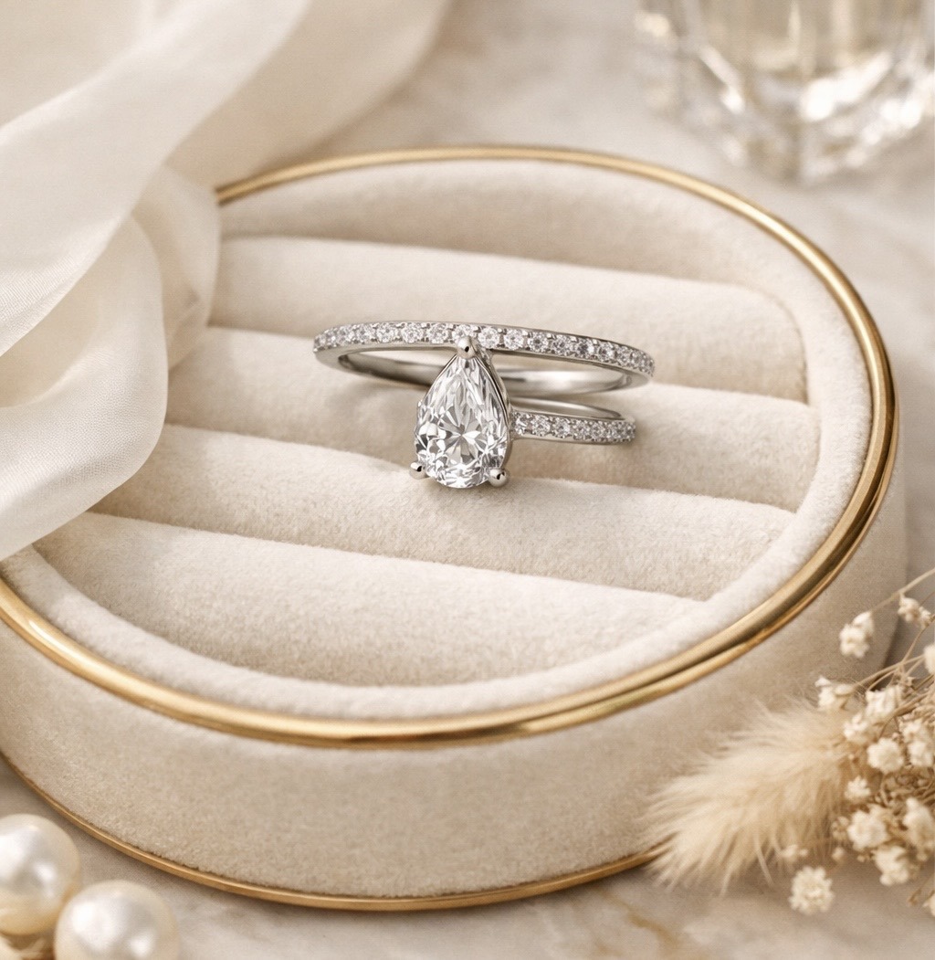 A sleek pear-cut diamond ring with a stylish double band and sparkling pavé details—perfect for a modern, elegant statement.
