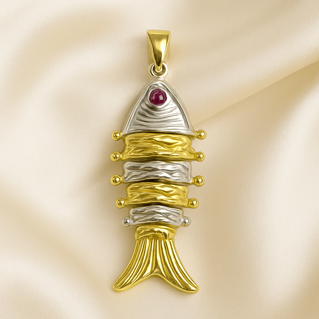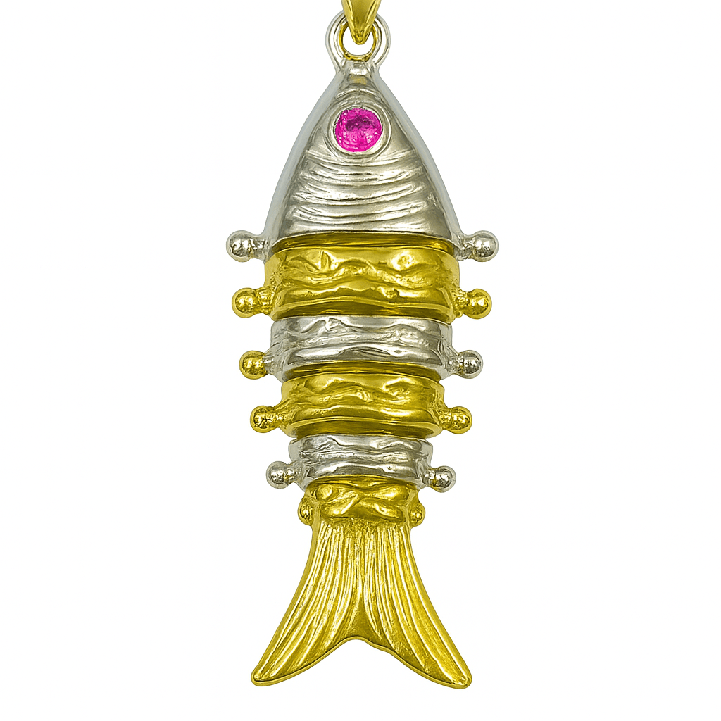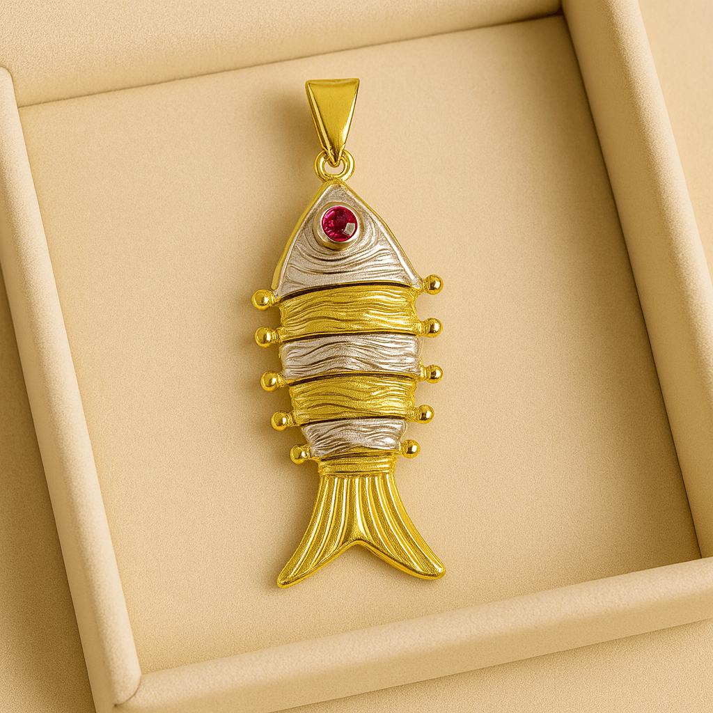 Inspired by elegance and symbolism, this stunning fish pendant necklace features a beautifully sculpted design in radiant gold and silver tones 🐟. Accented with a vibrant pink gemstone eye 💎, the pendant reflects craftsmanship, creativity, and timeless charm.