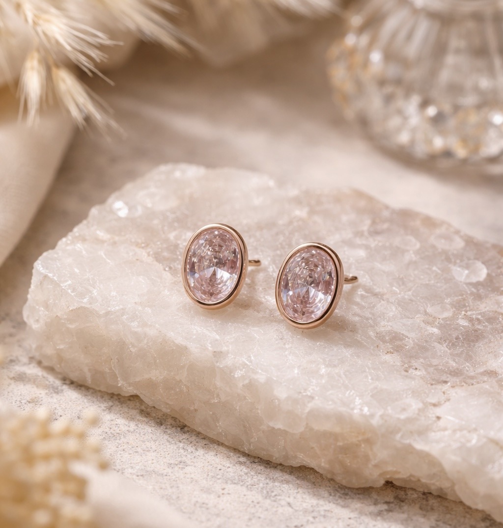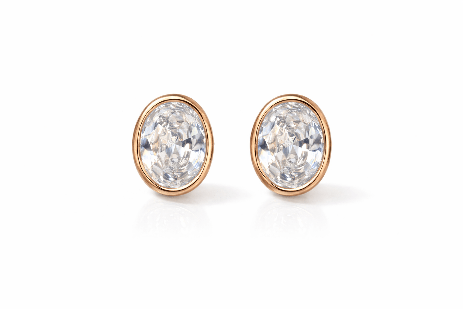 Add a touch of timeless elegance to your jewelry collection with these beautifully crafted oval stud earrings. Designed with a delicate rose gold finish and a sparkling clear crystal centerpiece, these earrings offer the perfect balance of sophistication and simplicity.