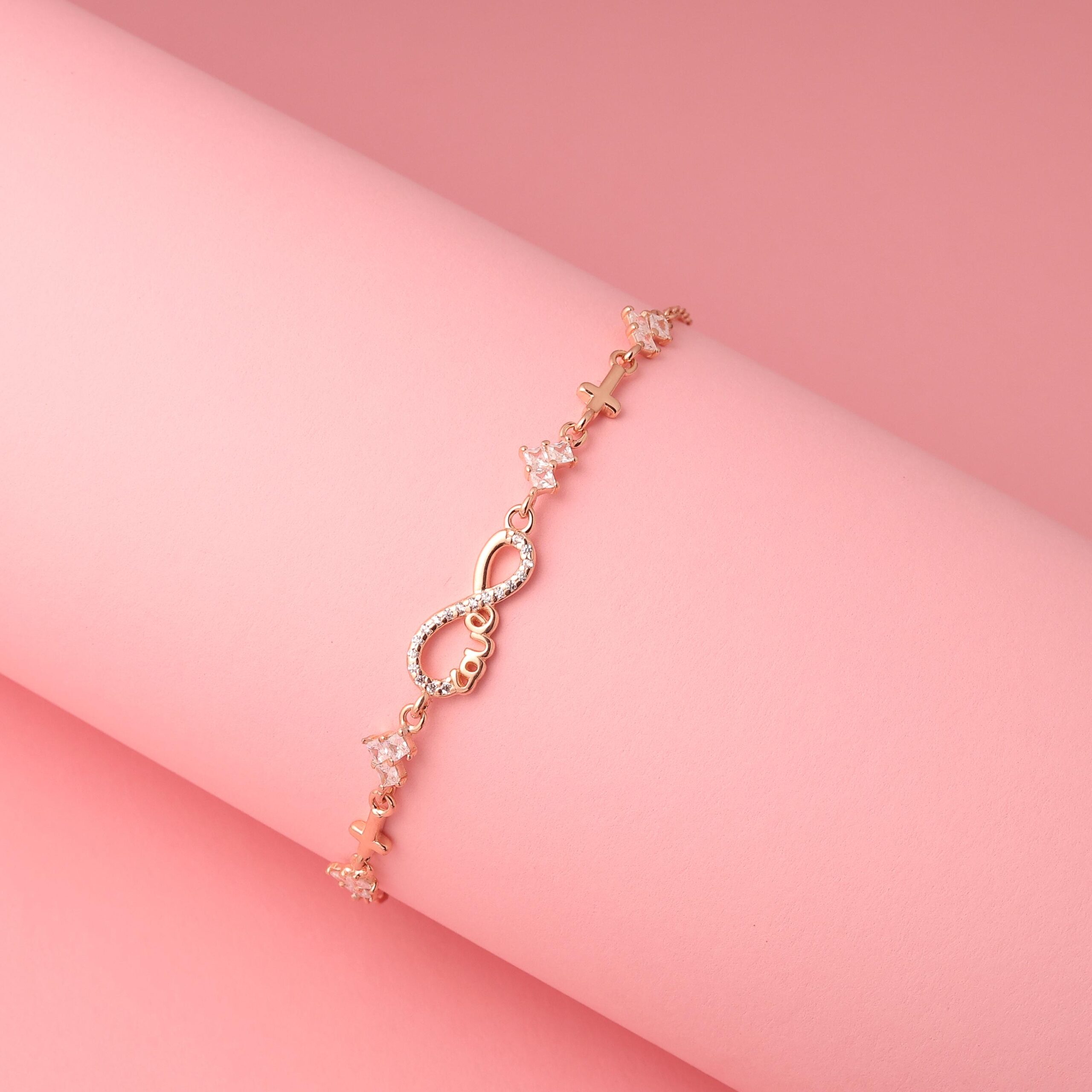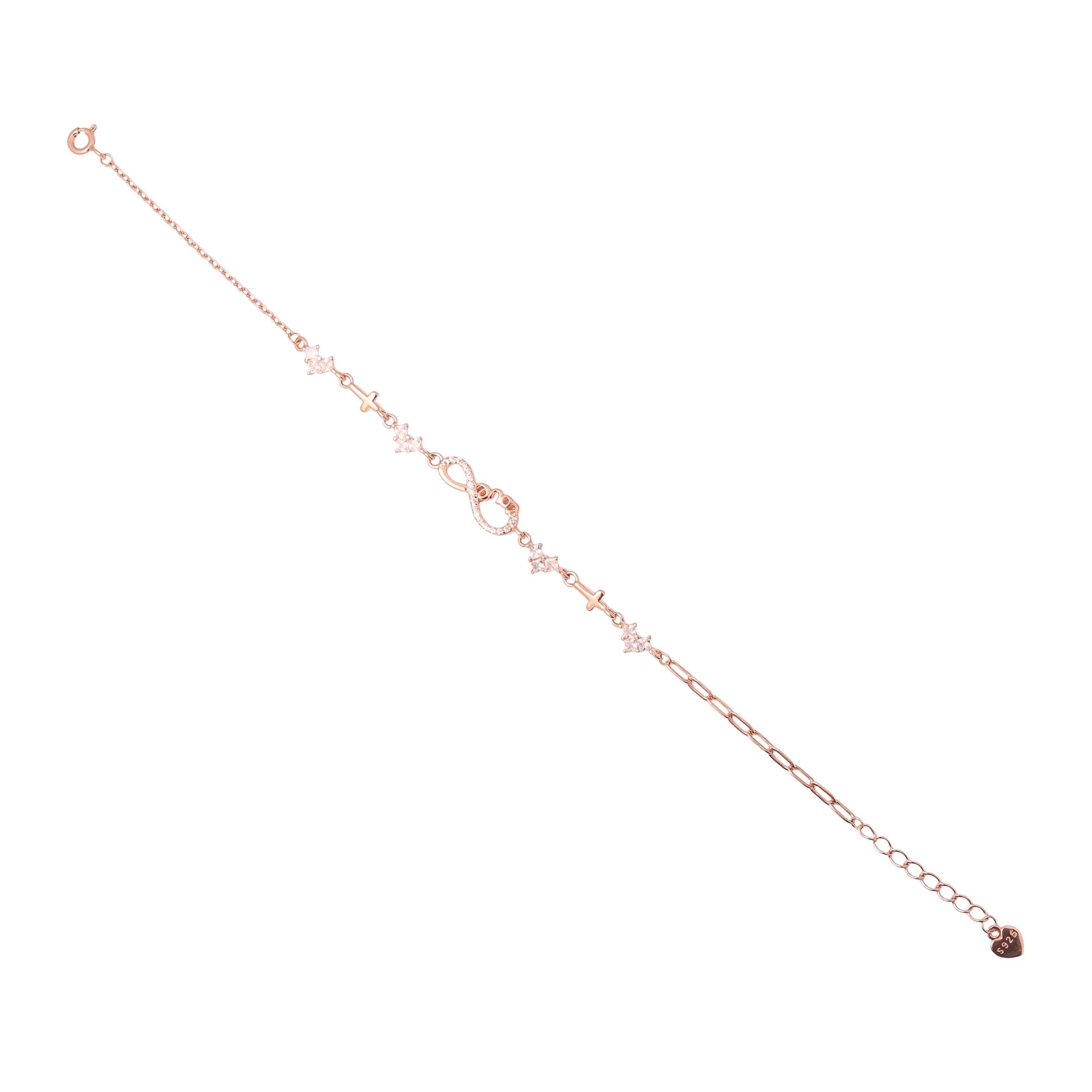 Delicate and meaningful, this rose gold–tone bracelet features an elegant infinity centerpiece symbolizing eternal love and faith. Accented with shimmering crystal stones and subtle cross charms, it blends modern elegance with spiritual significance. The refined chain design offers a graceful fit, making it perfect for everyday wear or special occasions. Whether worn alone or layered, this bracelet is a timeless accessory and a thoughtful gift for birthdays, anniversaries, confirmations, or moments of devotion.
