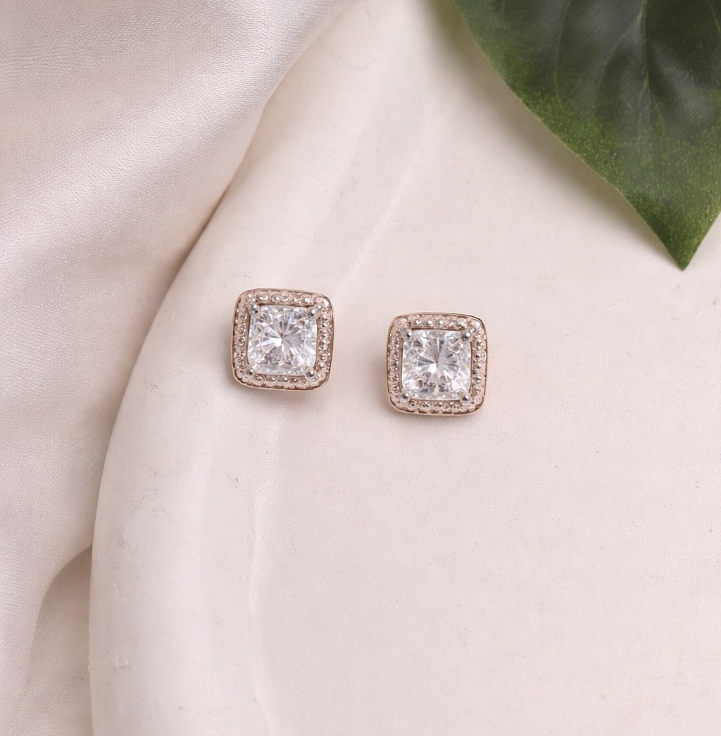 Elegant and timeless, these rose gold stud earrings feature a dazzling radiant-cut stone surrounded by a delicate halo—perfect for everyday sparkle or special occasions