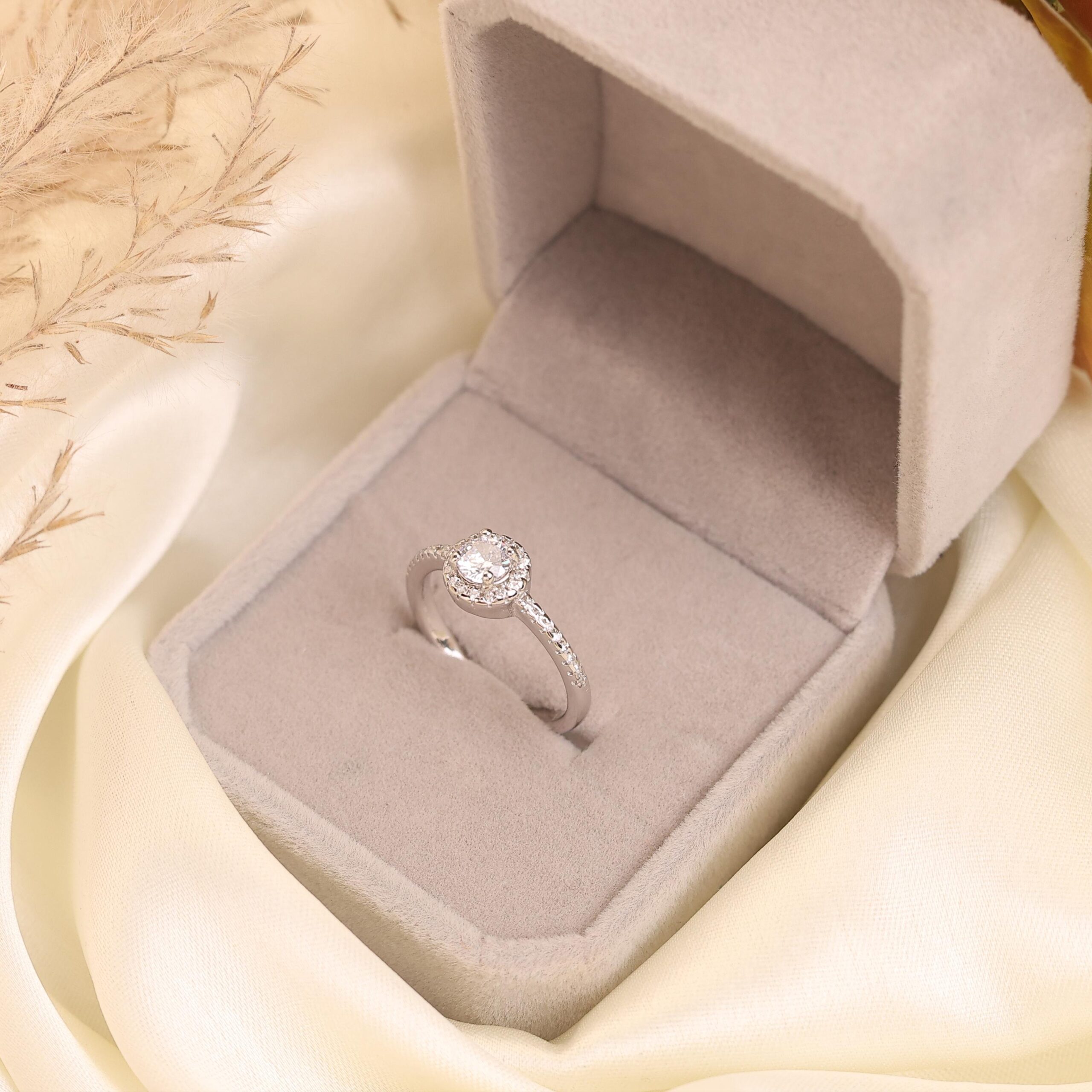 This stunning ring features a brilliant round center stone surrounded by a sparkling halo, creating a timeless and luxurious look.