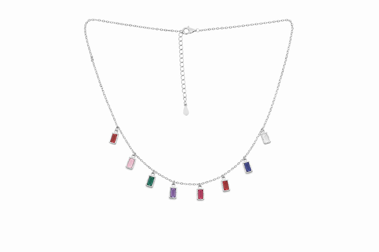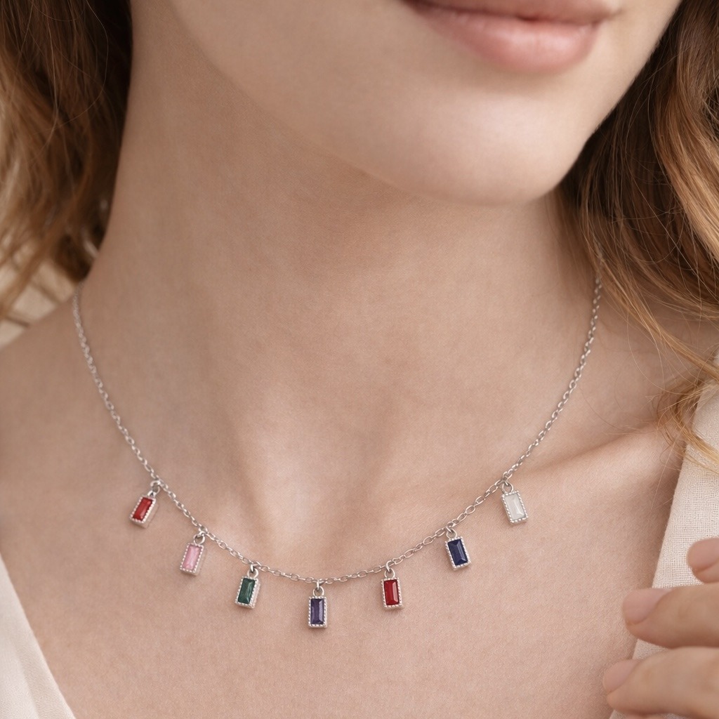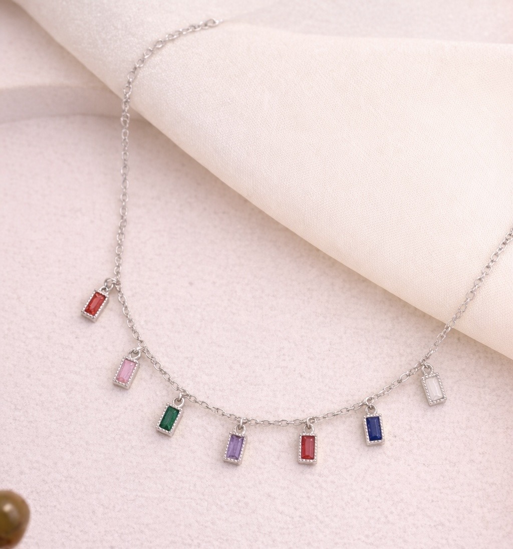 Crafted with a fine silver chain, this necklace features dainty rectangular gemstone charms in a stunning mix of colors—each carefully placed to create a balanced and eye-catching design ✨. The vibrant tones bring a fun yet sophisticated touch, making it perfect for both casual and dressy outfits.